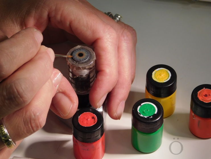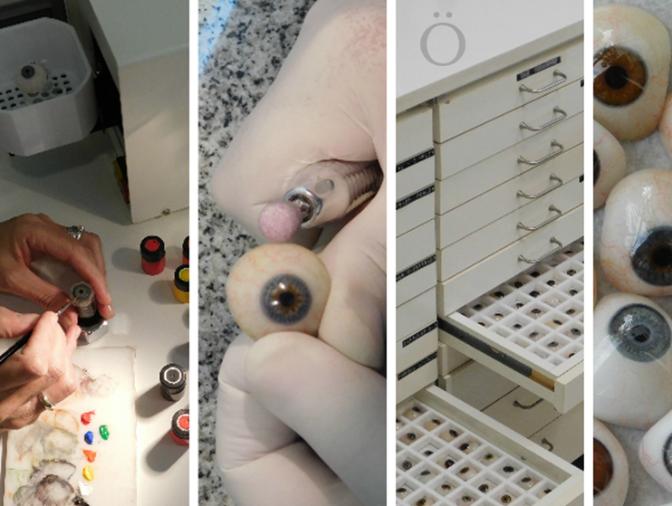 Una vez establecida la forma mediante la prótesis de prueba y moldeado, se determina el color de la esclera (parte blanca del ojo) como así también la cantidad y distribución de las venas. Pintoras especializadas realizarán en presencia del paciente, la fiel reproducción del iris y pupila, copiando el color y dibujo en detalle, y respetando los diámetros correspondientes a su ojo sano contralateral, logrando de esta manera una correcta adaptación de las prótesis oculares.